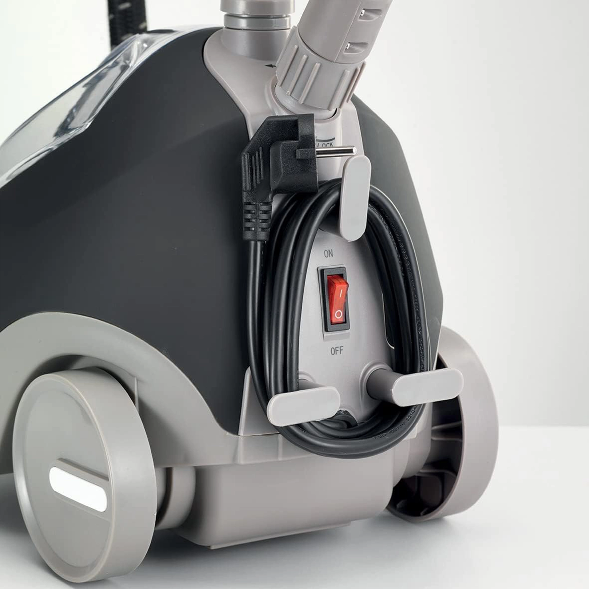Les accessoires incluent un cintre pliable et une pince pour pantalon/gant. Cordon d’alimentation de 1,7 m et tige télescopique pour plus de flexibilité et de contrôle.